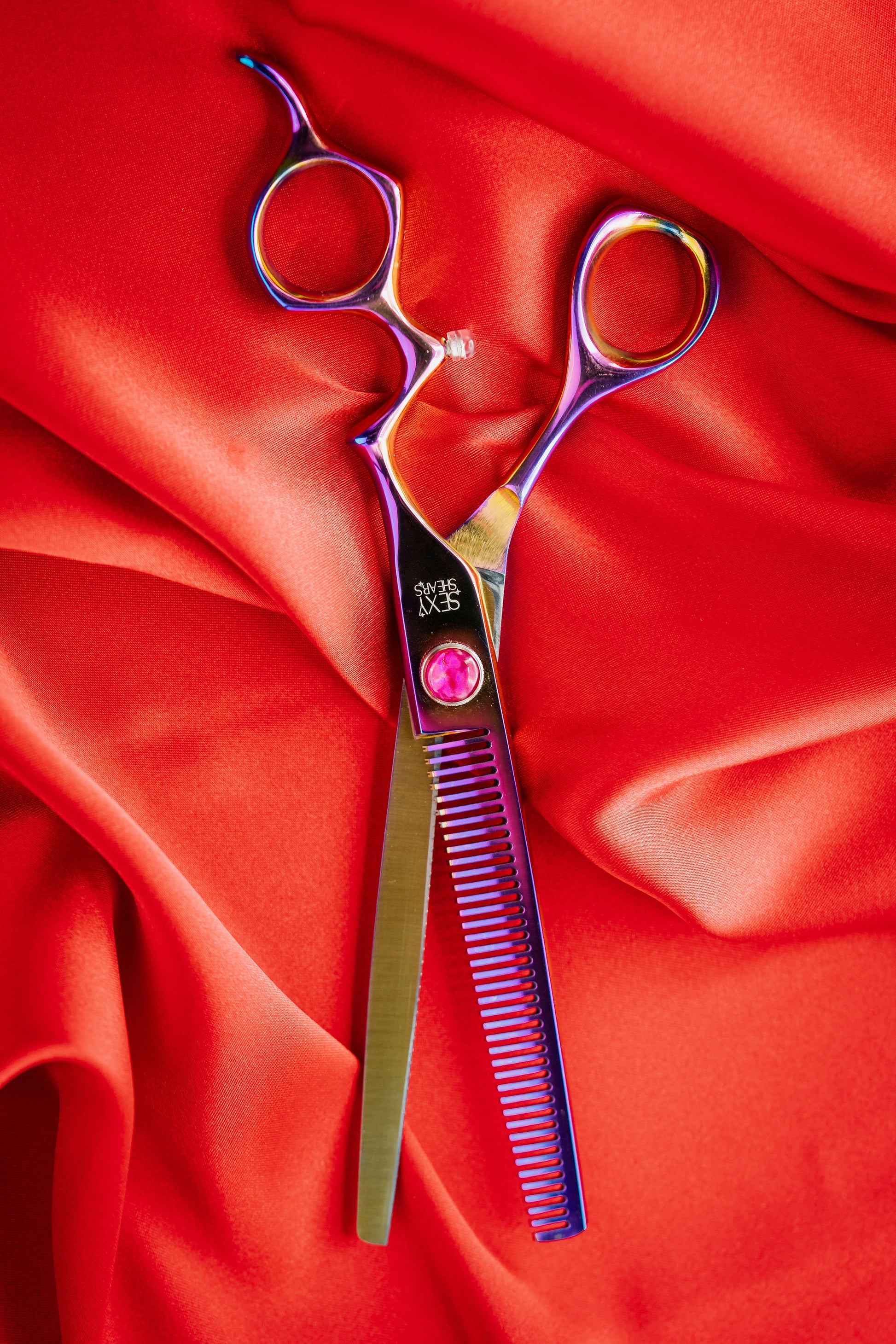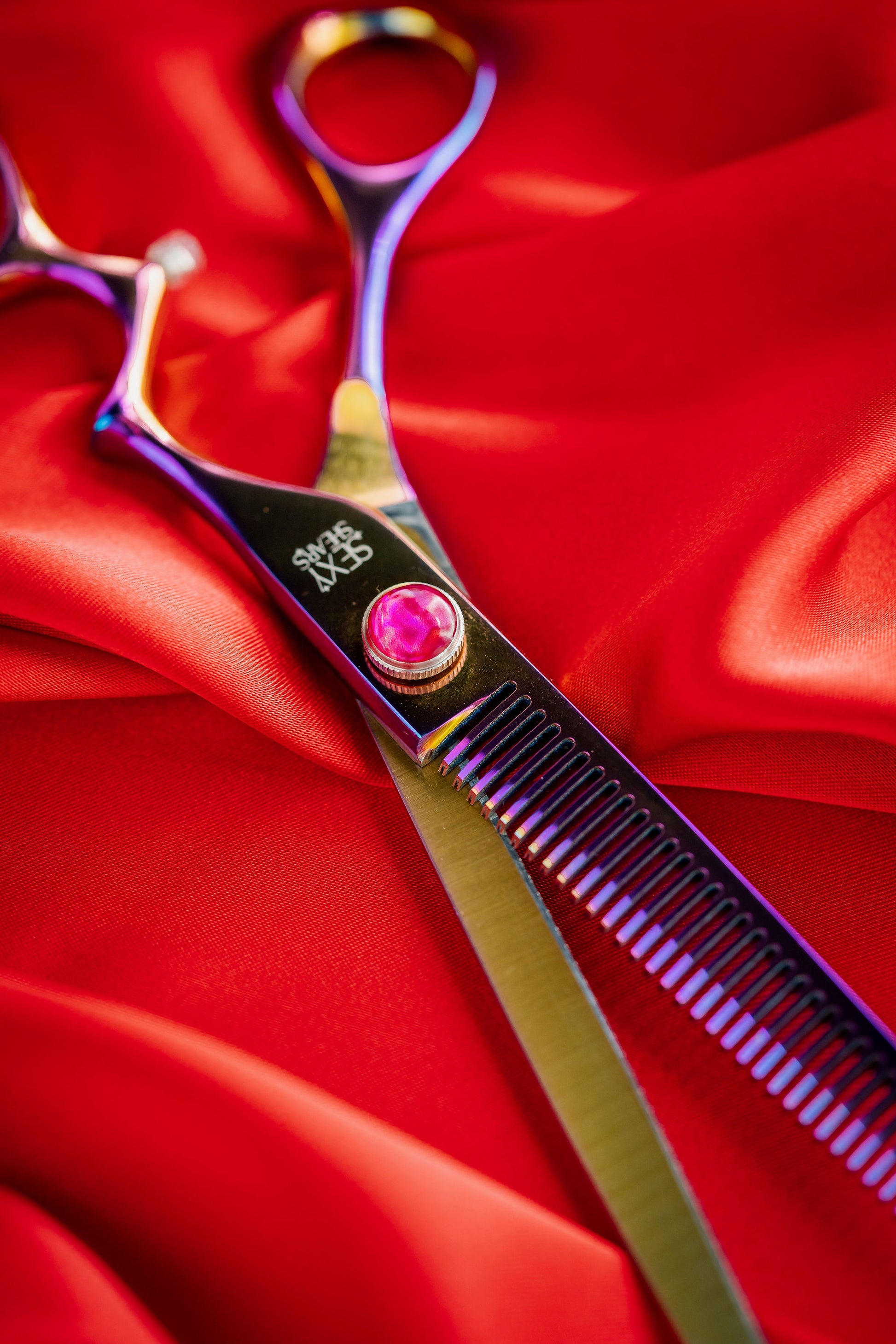 Introducing the "TEMPTATION Thinner" from Sexy Shears – a grooming tool that lures you into a world of alluring transformations. Crafted with precision, this 7" 420c steel Thinner with 40 teeth is coated in captivating titanium, adorned with a bevel edge that adds a touch of wickedness to every snip. As your fingers glide along its sleek frame, every grooming session becomes a flirtatious dance of precision and passion.